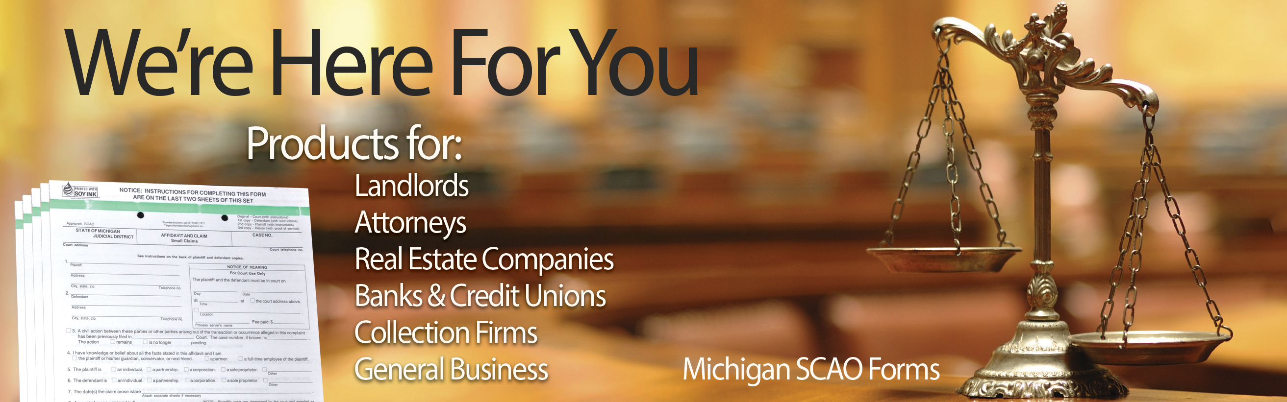 During this unprecedented time of uncertainty we're still here for you, providing the same great service you've come to expect from us. Place an order for legal forms online, by email or by phone and receive your forms in one to two business days. We also offer solutions to your other printing needs, including custom forms, pre-printed forms, pre-collated sets, postcards, brochures, letterhead and envelopes.